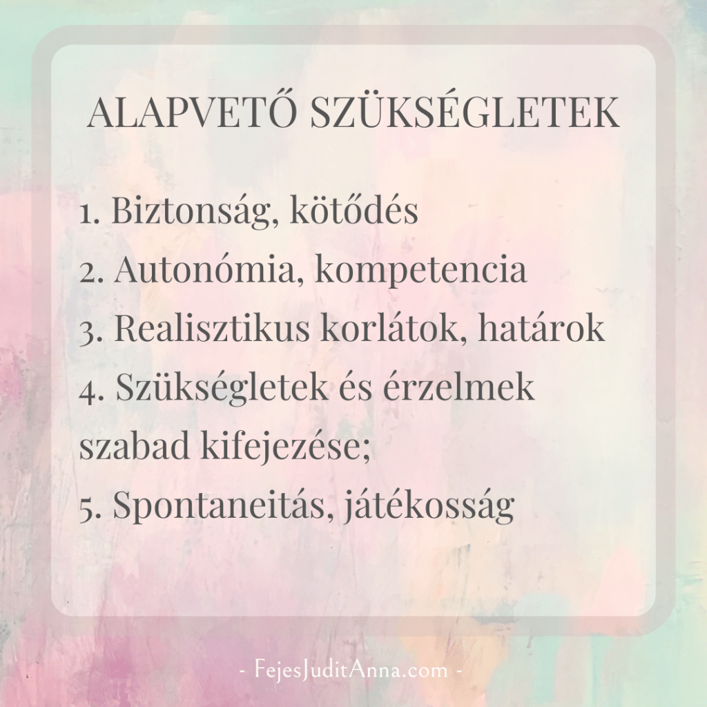 Alapvető érzelmi és pszichés szükségleteink: 1. Biztonság, kötődés; 2. Autonómia, kompetencia; 3. Realisztikus korlátok, határok (önkontroll alapja); 4. Szükségletek és érzelmek szabad kifejezése; 5. Spontaneitás, játékosság. Amennyiben a korai években valamelyik szükségletünk sérül, maladaptív séma alakul ki.